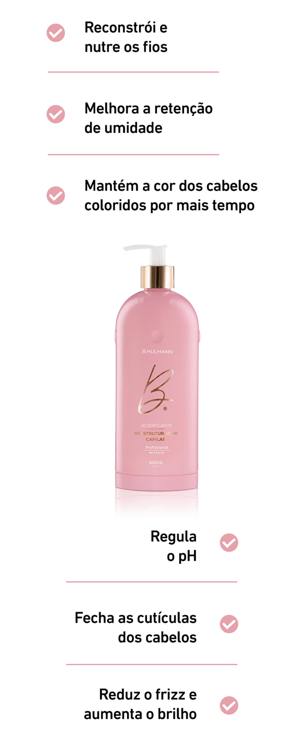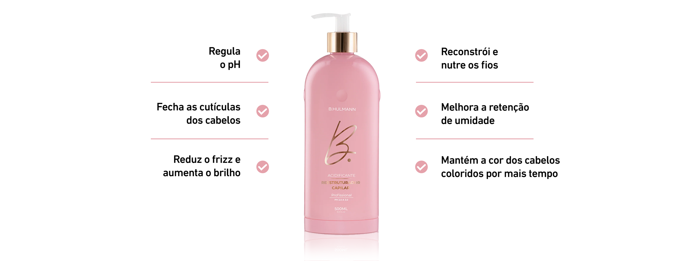Nosso acidificante é um produto 3 em 1. Ele regula o pH, reconstroi e nutre os fios, dispensando qualquer outro produto após, como condicionador ou máscara.