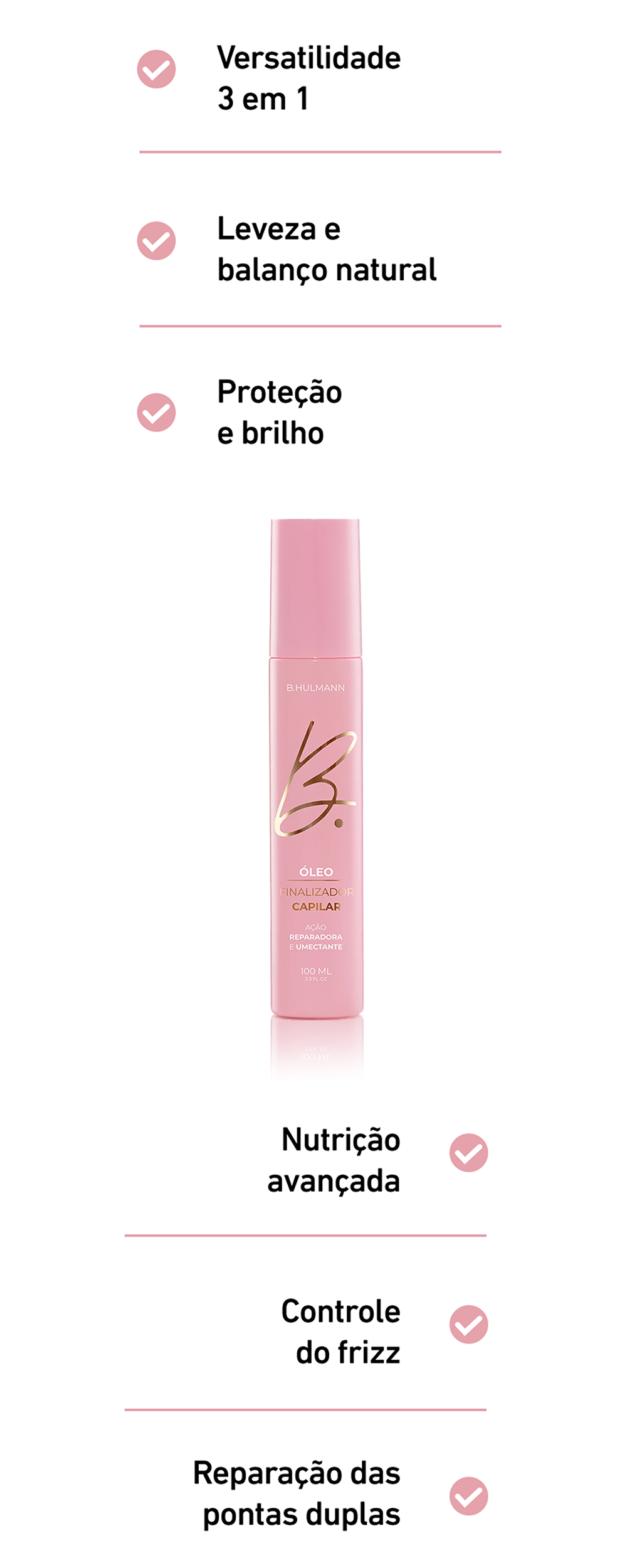 O Óleo Reparador 3 em 1 não é apenas um produto; é o cuidado completo que seus cabelos merecem. Composto por 12 óleos vegetais, ele nutre, protege e restaura os fios, combatendo o frizz e as pontas duplas sem pesar. Sua fórmula inteligente funciona como reparador de pontas, umectante noturno e intensificador de tratamentos, garantindo fios alinhados, sedosos e cheios de vida.